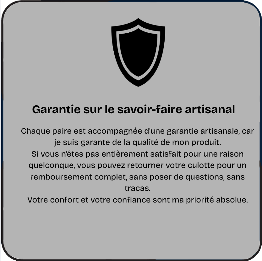 Si vous n'êtes pas entièrement satisfait pour une raison quelconque, vous pouvez retourner votre culottes pour un remboursement complet, sans poser de questions, sans tracas.